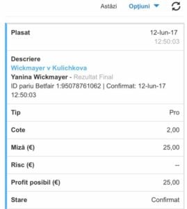 Primul meu pariu îl puteți vedea în imaginea de mai jos, (cei care nu îl văd trebuie să dezactiveze ad-blocker din varianta desktop) și am mizat la cota 2.00 pe victoria Yaninei Wickmayer în fața Elizavetei Kulichkova. Meciul începe de la 19.00 ora noastră și se dispută la Nottingham pe iarbă, cota este disponibilă în Betfair Exchange, probabil la casele de pariuri este mai mică. Vă puteți face și voi un cont nou la Betfair prin acest link, iar eu vă voi ajuta să vă înmulțiți banii!