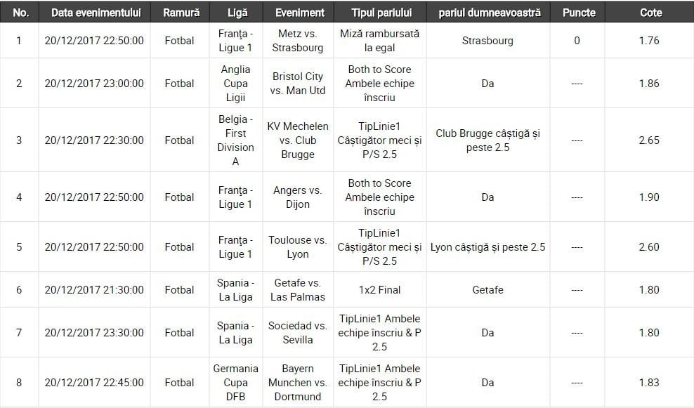 Voi face pe plac cititorilor, dar vă sfătuiesc să țineți cont și de indicațiile mele. Toate cele 8 meciuri selectate sunt conform scurtei analize proprii și conform opticii mele, deci puteți selecta doar ceea ce vi se pare conform cu opinia proprie.
