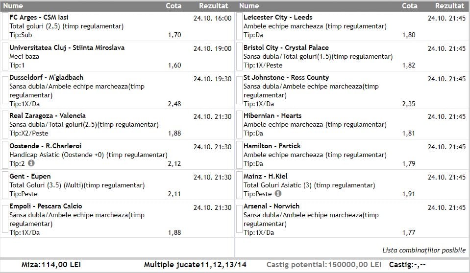 Sunt nu mai puțin de 14 meciuri selectate de mine pe acest bilet și le-am jucat combinate câte 11, 12 și 13. Cotele sunt destul de mari, de la 1.60 în sus, astfel că e nevoie și de multă șansă pentru a prinde minim 11.