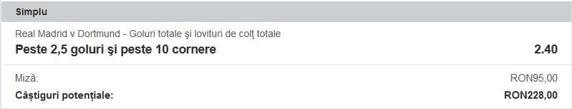 Ok, meciul e deschis oricărui rezultat, deși Dortmund se confruntă cu foarte multe absențe. Drept pentru care am ales să mizez pe o combinație foarte interesantă care implică goluri și cornere. Este bine-cunoscut faptul că Real Madrid este o echipă ce dezvoltă foarte bine jocul pe benzi, unde au jucători absolut formidabili. Acest lucru se reflectă și în numărul mare de cornere pe care galacticii îl bifează în fiecare meci.