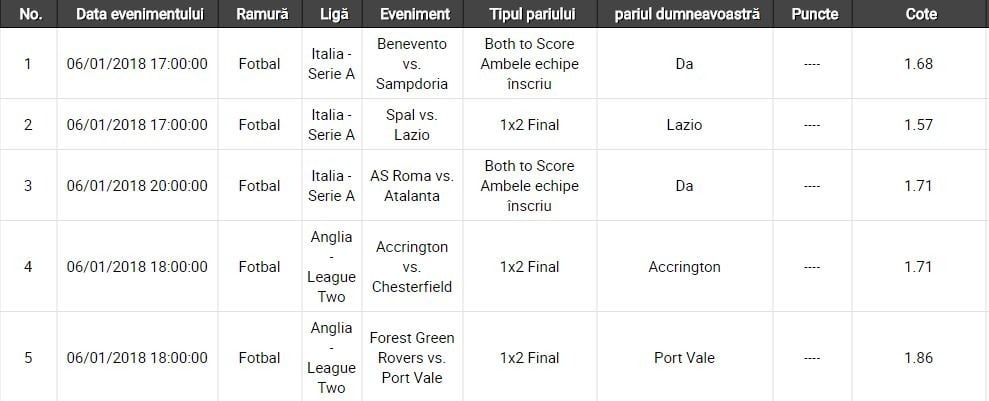 Ieri am câștigat biletul de cota 2.60 propus pe site, și am bifat și multe alte câștiguri în grupul Premium! Astăzi am plasat un pariu în sistem și sunt convins că mulți dintre voi abia așteaptă astfel de bilete.