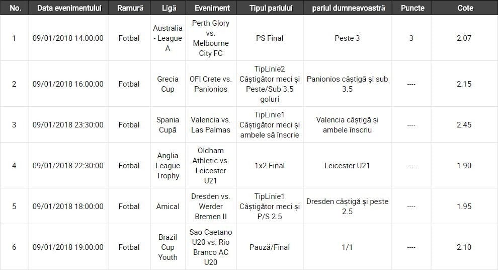 Pentru azi am pregătit un nou bilet pe care l-am jucat în sistem. Chiar dacă oferta nu este foarte generoasă, eu am identificat pentru azi câteva meciuri de pe urma cărora se poate profita, pentru că există valoare în cote!