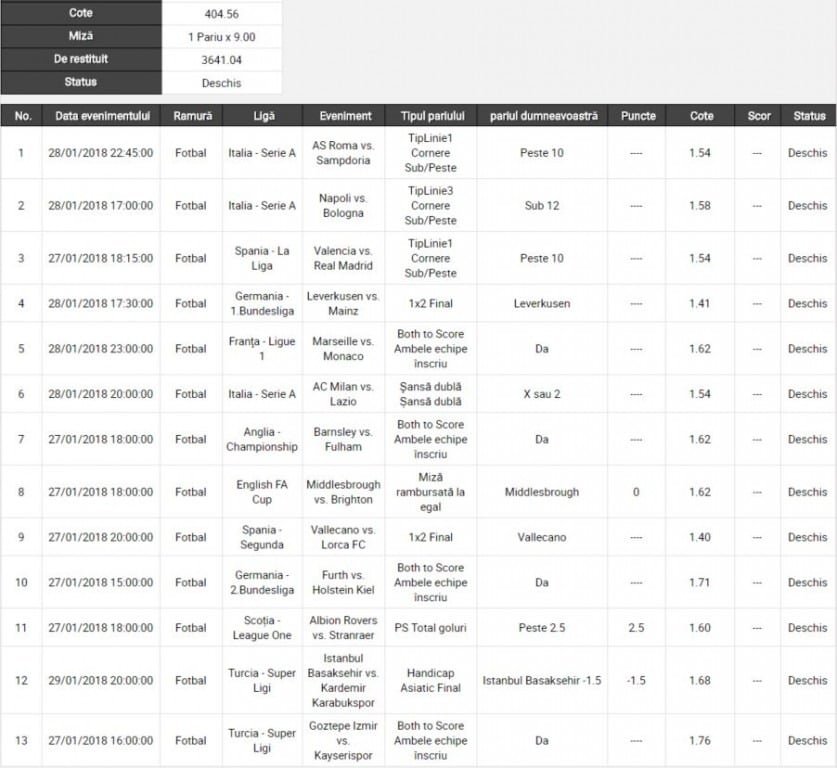 Am selectat 13 meciuri, pe care le-am jucat pe o variantă simplă, care dau o cotă finală astronomică, care depășește valoarea de 400. De asemenea, cele 13 meciuri le-am combinat și câte 12, dar și câte 11, tocmai pentru a câștiga ceva chiar dacă se pierd două dintre ele!