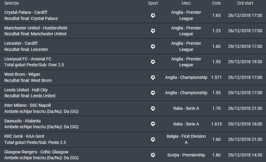 Prieteni, eu voi încerca să dau o ultimă lovitură pe acest final de an 2018 cu un bilet de cota 100 format din 10 meciuri care se dispută pe 26 și 29 decembrie.