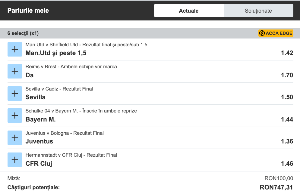 Cota finală este 10+, dar a fost aplicată asigurarea ACCA EDGE disponibilă în Betfair Sportsbook, o asigurare prin intermediul căreia ne primim banii înapoi dacă se pierde un singur meci de pe tot biletul și pe care vă recomandăm să o folosiți!